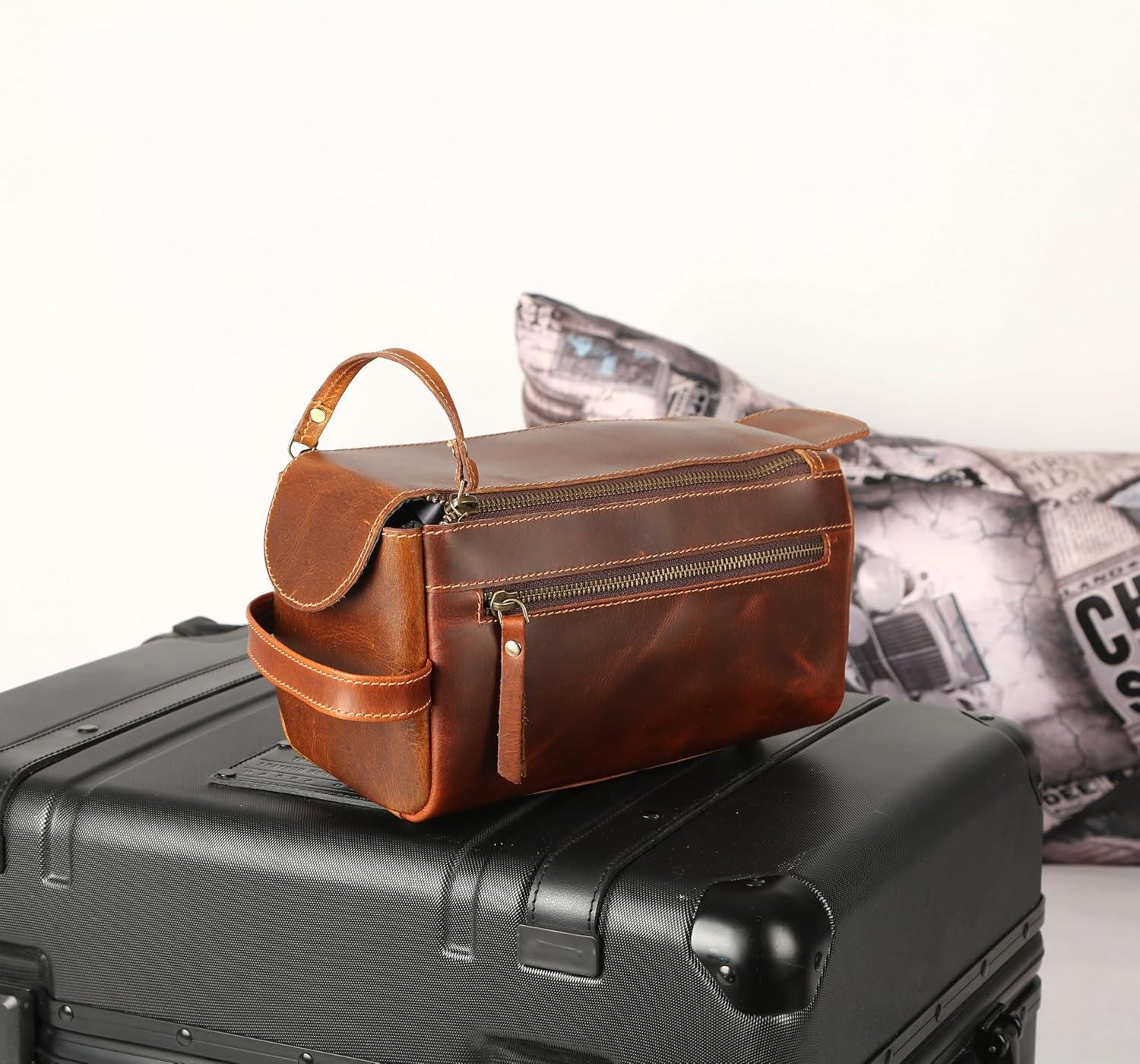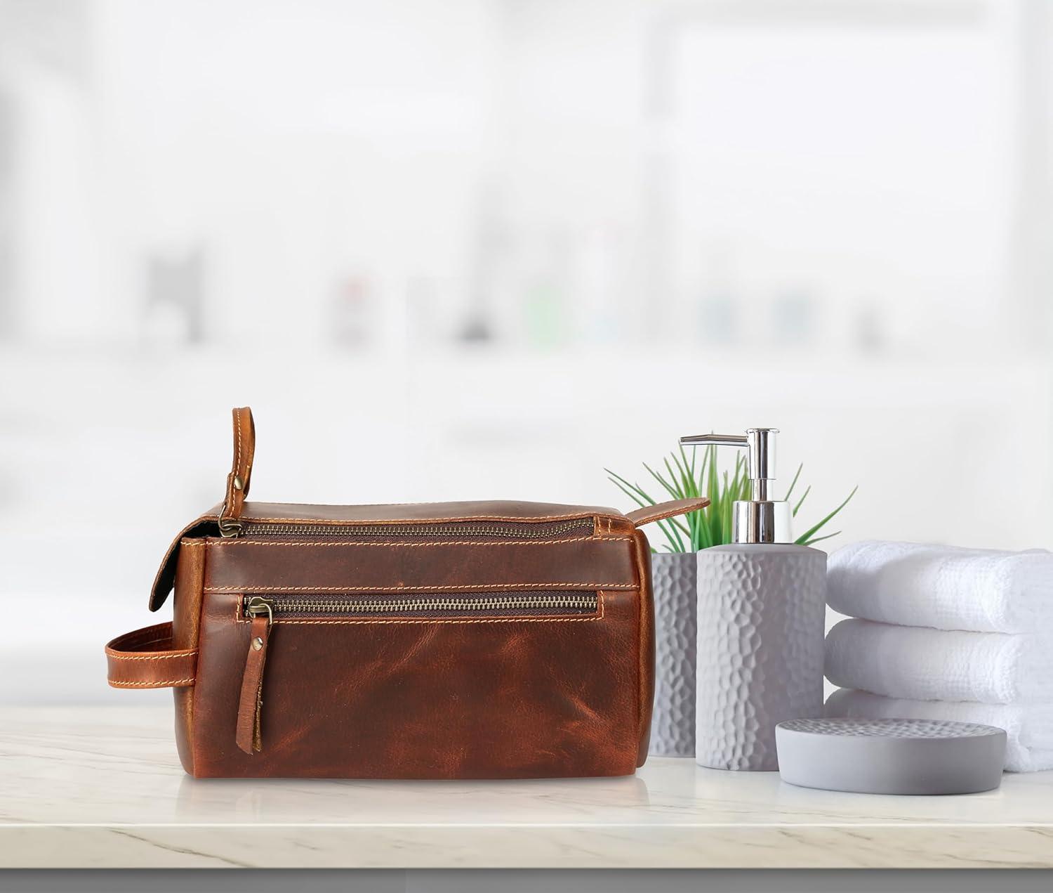 KomalC Premium Buffalo Leather Toiletry Bag for Men & Women – Leather Dopp Kit With Water resistant Lining, Premium Toiletry Travel Pouch, Unisex Wash Bag for Toiletries, Gifts for Men and Women(Chicago Buff)